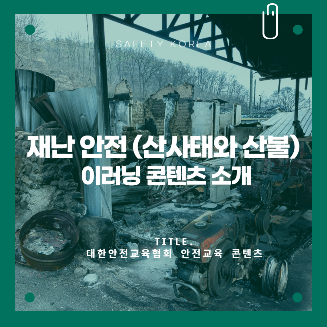 오늘은 대한안전교육협회의 재난 안전 이러닝 콘텐츠 중 산사태와 산불에 관한 내용과 함께 자연 재난이 발생했을 때 사업장에서 안전하게 대처하는 방법을 생각해보겠습니다.