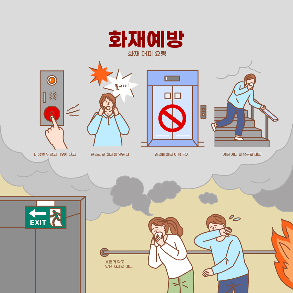 - 연기 대처: 화재보다 더 위험한 것이 연기입니다. 연기는 시야를 가리고 호흡 곤란을 유발하기 때문에 반드시 옷이나 손수건으로 코와 입을 가리고, 낮은 자세로 이동해야 합니다. 특히 플라스틱이나 합성수지에서 발생하는 연기는 유독가스를 포함하고 있어 몇 번의 흡입만으로도 의식을 잃을 수 있습니다.