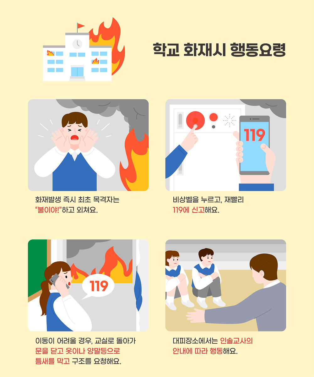 - 응급조치 : 연기를 흡입해 호흡 곤란이나 두통을 호소하는 학생이 있다면 신선한 공기를 마시게 하고, 의식이 없는 경우 심폐소생술을 시도해야 합니다. 학교에 상주하는 보건교사가 있다면 즉시 인계하고, 동시에 119에 신고해야 합니다.